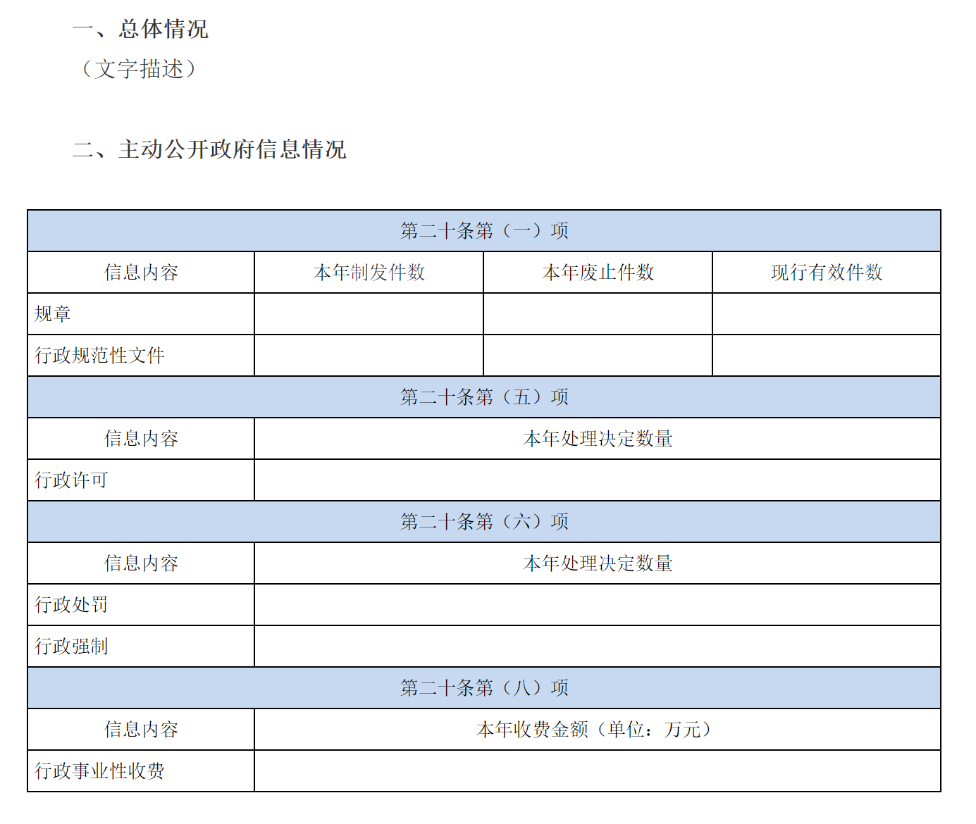 各行政机关年度报告格式模板附后。此前有关政府信息公开的各类报告和统计口径,随原政府信息公开条例的失效而失效。政府信息公开工作主管部门负责汇总的本级政府年度报告格式,参照这一格式模板办理。党的工作机关加挂行政机关牌子的单位,年度报告内容依据全国政府信息公开工作主管部门发布的有关规定(国办公开办函〔2019〕51号)确定,并参照这一格式模板办理。
